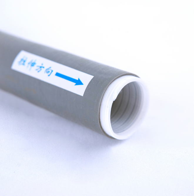 高壓冷縮絕緣管,如下面圖片,灰白亮色,灰色是由硅橡膠制成的冷縮絕緣管,里面白色的為絕緣管本部支撐條,因?yàn)槔淇s類產(chǎn)品本身不需要加熱即可完成收縮過(guò)程,收縮方式就是抽出內(nèi)部支撐條,絕緣管在自然溫度下即可進(jìn)行回縮。